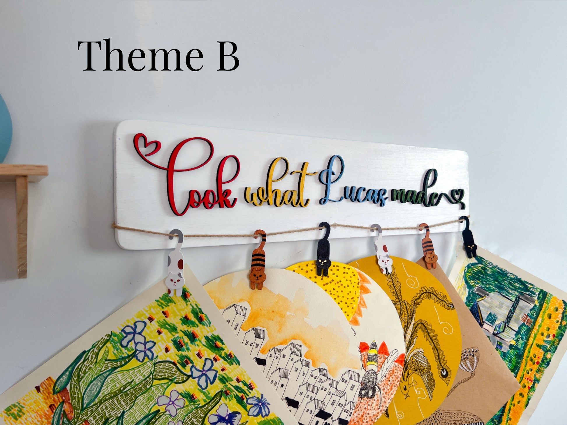 The color of the board is divided into with wood grain effect and without wood grain effect. You can choose according to your preference. The masterpieces-themed art display board uses the color transformation of each letter to form a rainbow of colors. The clips are all made of wood, with colorful clips and cat-shaped clips.