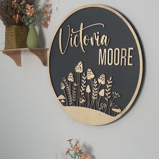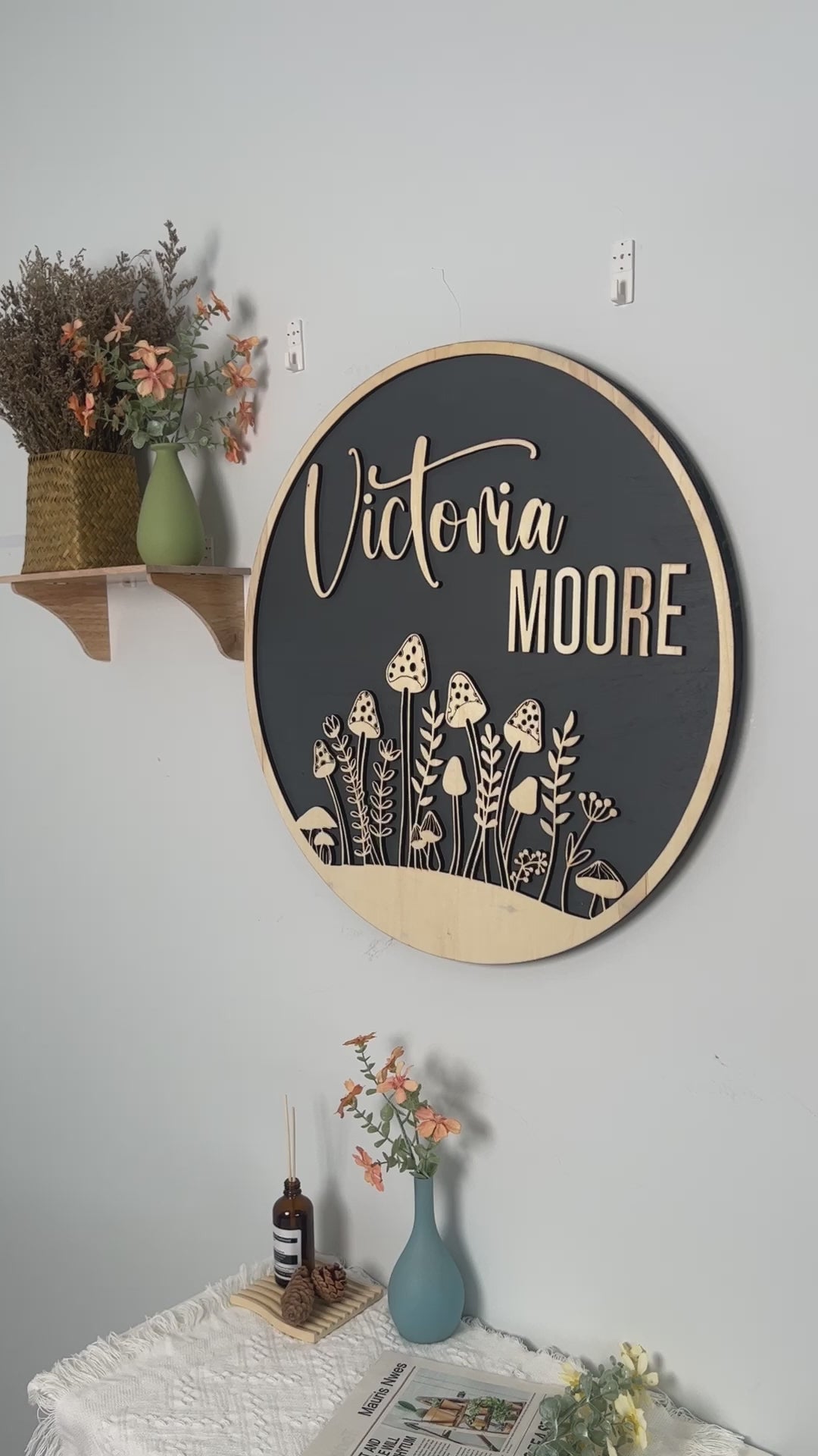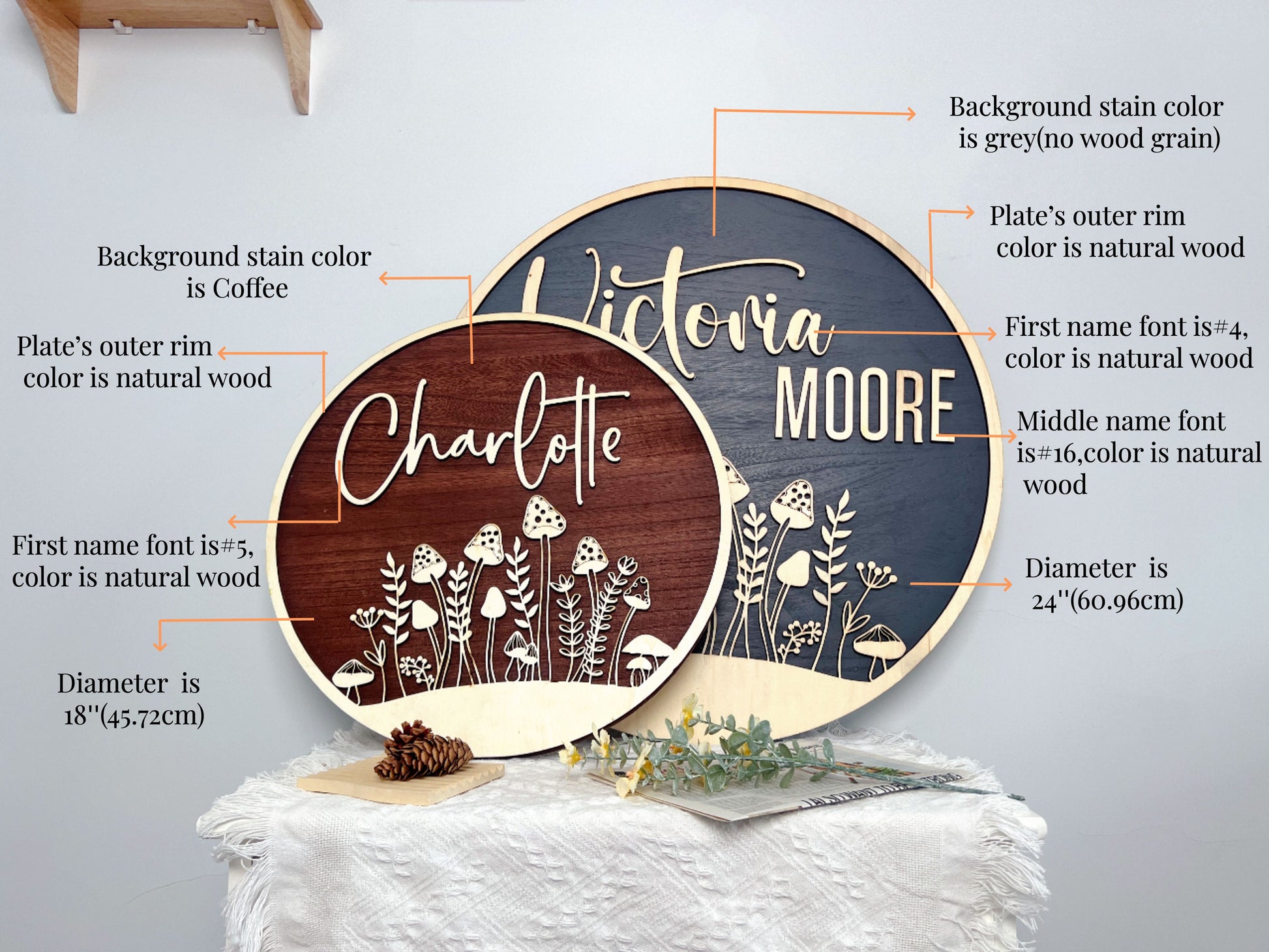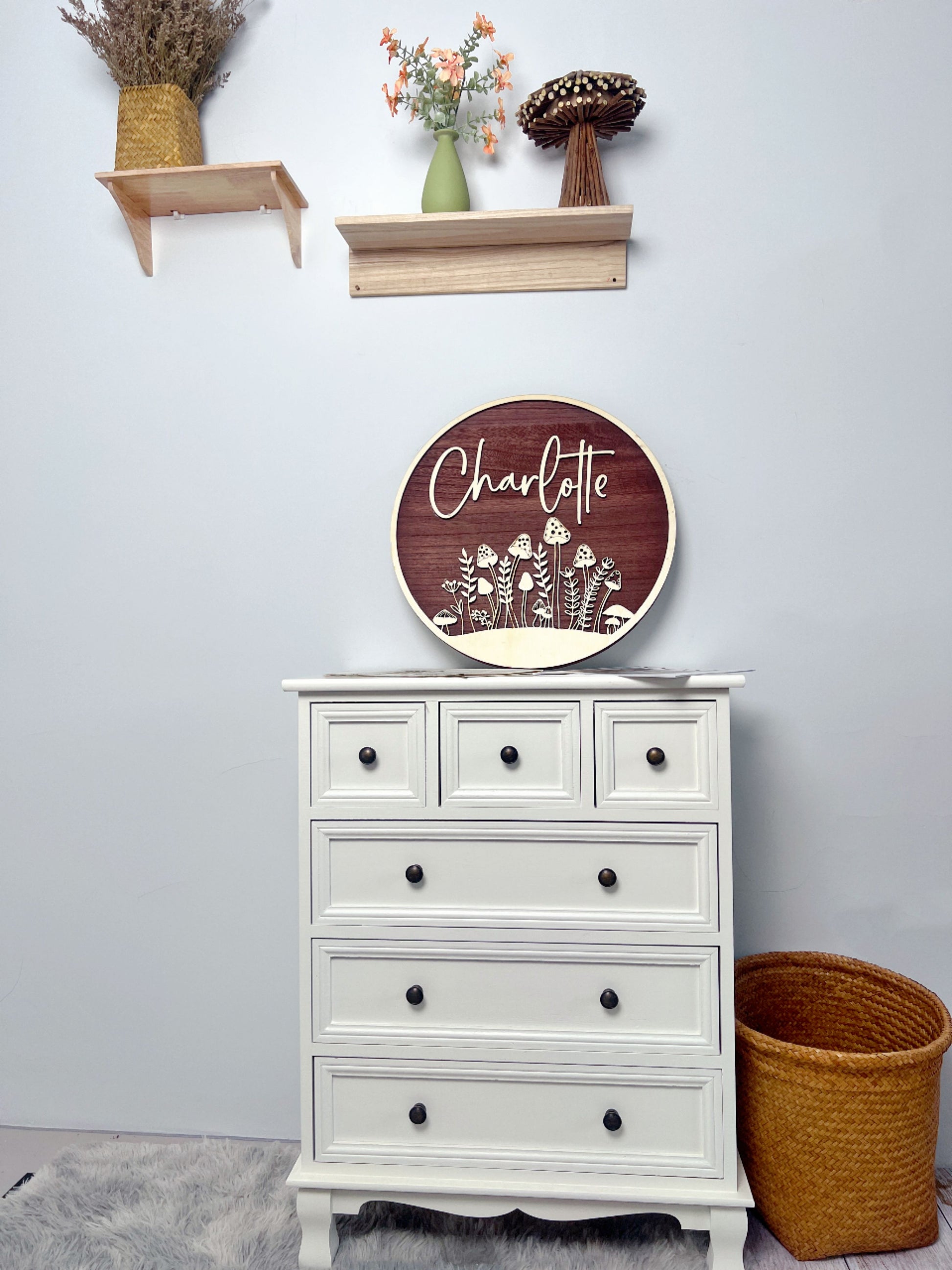 This is a round 3D wooden name sign for baby with the theme of wild flowers and mushrooms.The plate’s outer rim is natural wood without any other color. The name sign made of wild flowers, mushrooms, children's names, and natural wood means to let your girls or boys stay wild and stay happy. This Sign is very suitable for mothers-to-be to prepare as gifts for their children, and it is also very suitable as a gift for family or friends on baby shower or children's birthday.